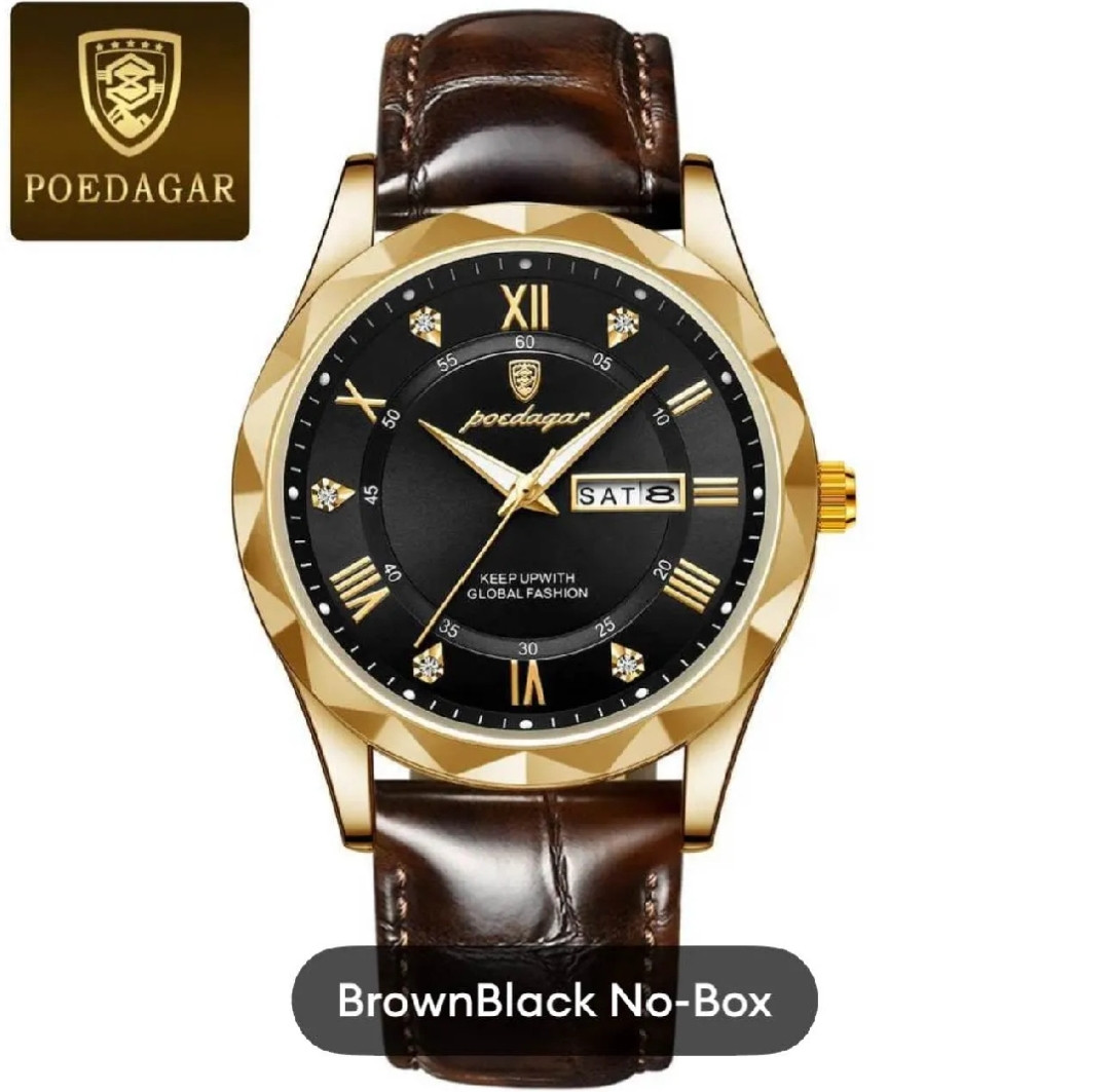 Case Thickness: 11.0mm Band Width: 20.0mm Band Material Type: Leather Dial Window Material Type: Glass Model Number:615 Dial Diameter: 41.0mm Feature :Complete Calendar - Day, Calender Water Resistance:3Bar Band Length: 24.0cm Case Material: ALLOY Movement Quartz Style: Fashion & Casual Brand Name: Poedagar • Visit Store> Origin Mainland: China Certification: CE Item Type: Quartz Wristwatch